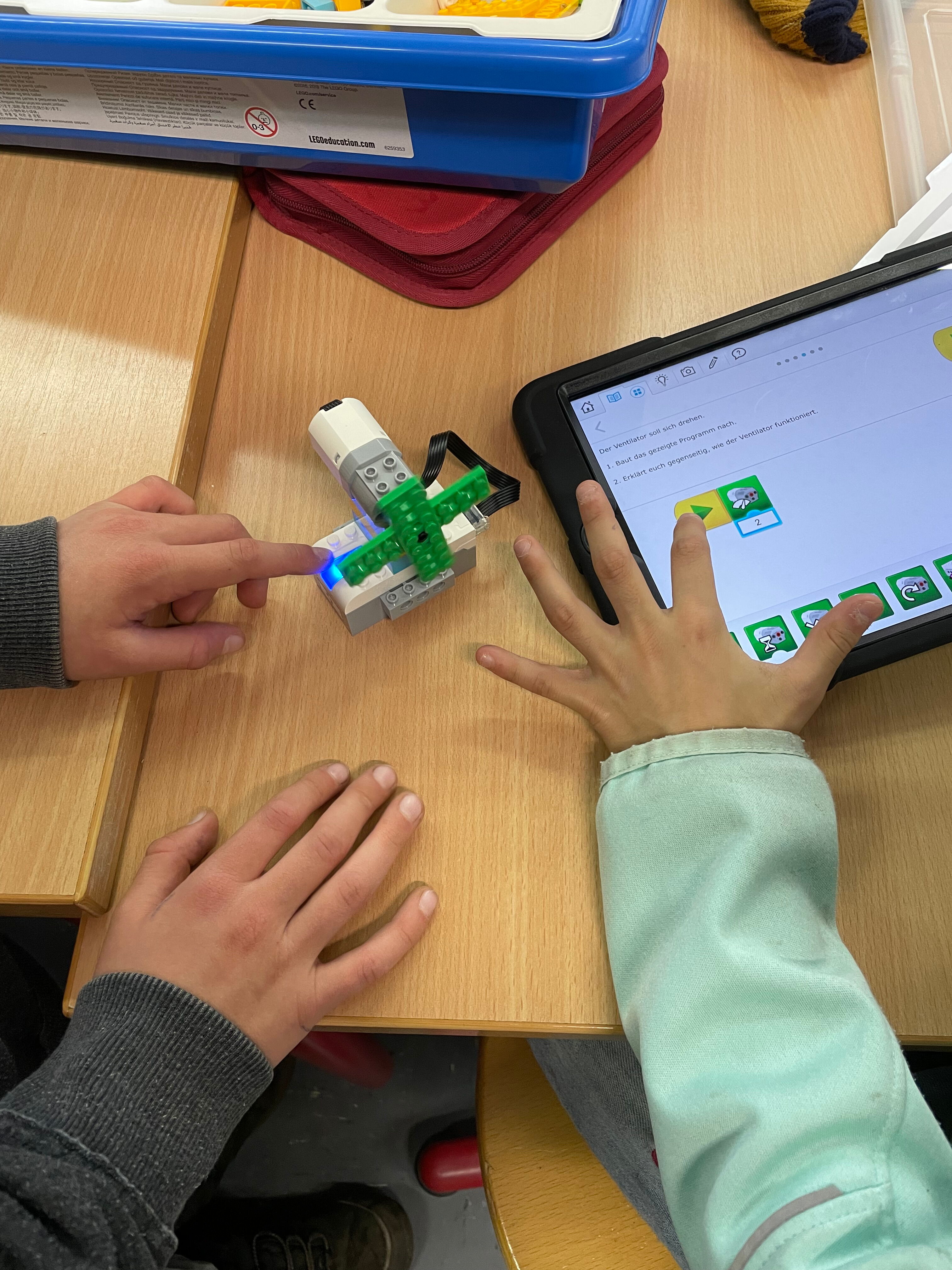 In diesem Halbjahr hat der Forderkurs der 3. Klassen begonnen sich mit dem Programmieren von einem Roboter auseinanderzusetzen. Zu Beginn des Schuljahres haben die SchülerInnen begonnen den Calliope Mini kennenzulernen und mit Hilfe von Open Roberta kleinere Programme zu programmieren. So entstanden blinkende Smileys, Namensschilder oder ein mini Klavier, was Töne von sich gab. Seit November ist der Kurs nun dabei sich mit dem Lego WeDo 2.0 zu beschäftigen. Mit einem Tablet und einem Baukasten ausgerüstet sind die Kinder gestartet und haben einen Ventilator gebaut und so programmiert, dass er sich sogar in unterschiedliche Richtungen drehen kann.