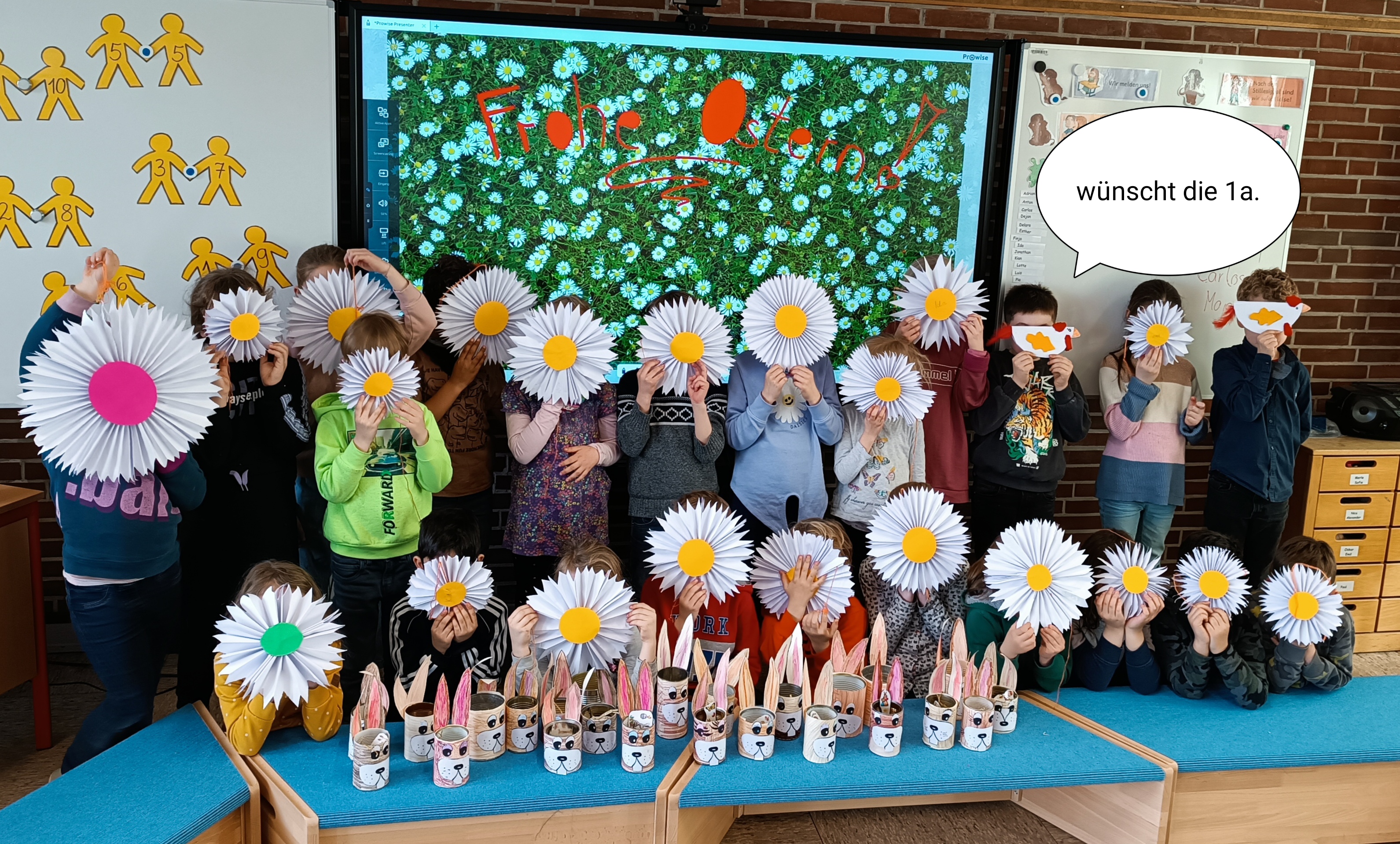 Die Klasse 1a wünscht frohe Ostern. Es wurde passend zum Thema gebastelt und gesungen. Krönender Abschluss war ein gemütliches Osterfrühstück in der Klasse.